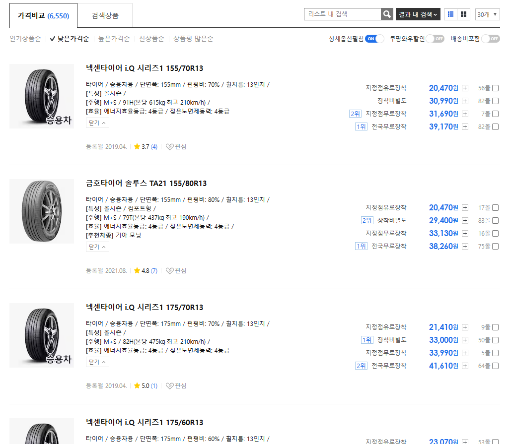 다양한 타이어를 최저가부터 인기 있는 모델까지 한눈에 쉽게 볼 수 있습니다. 또한 별도로 장착할지 아니면 무료 장착할지 선택할 수 있어서 편리합니다.