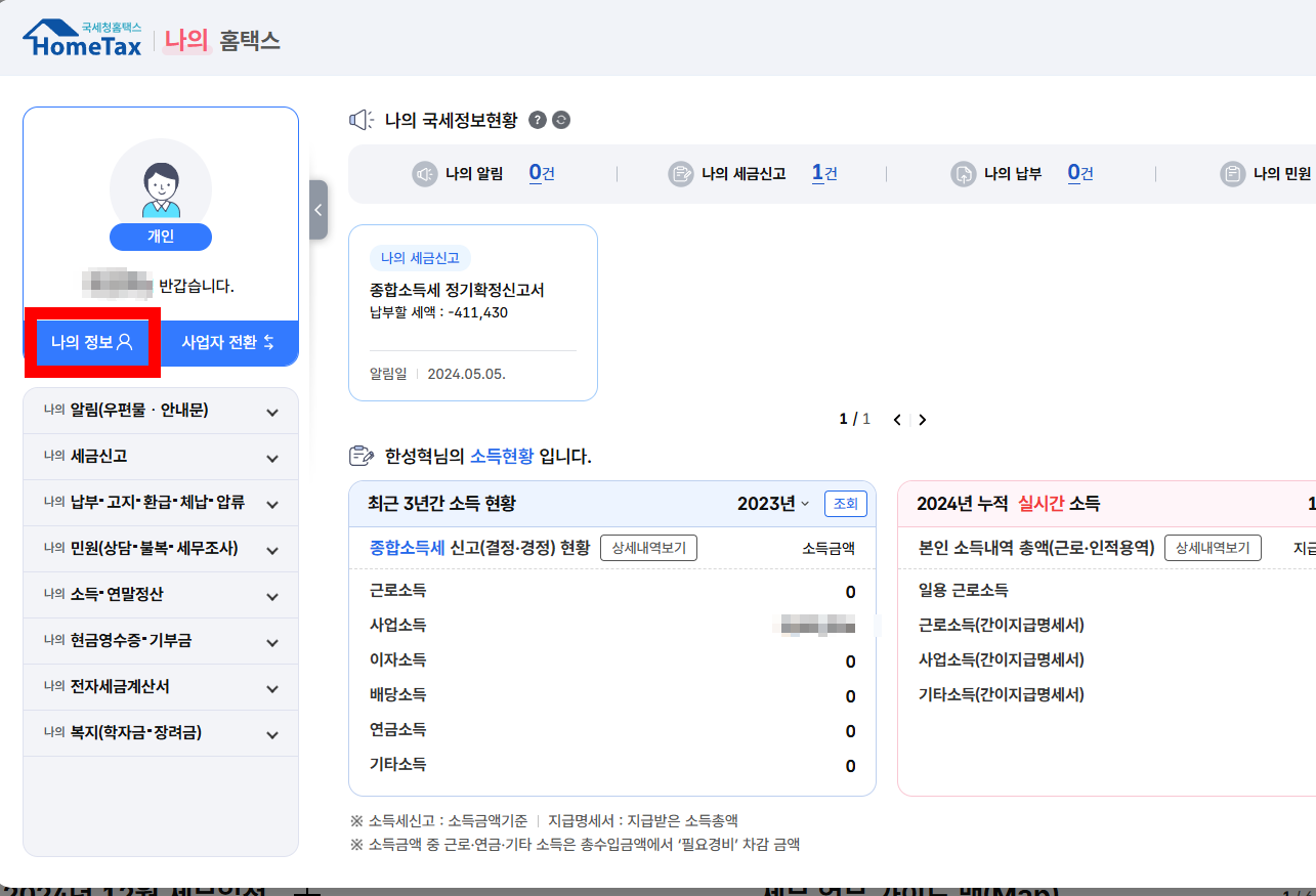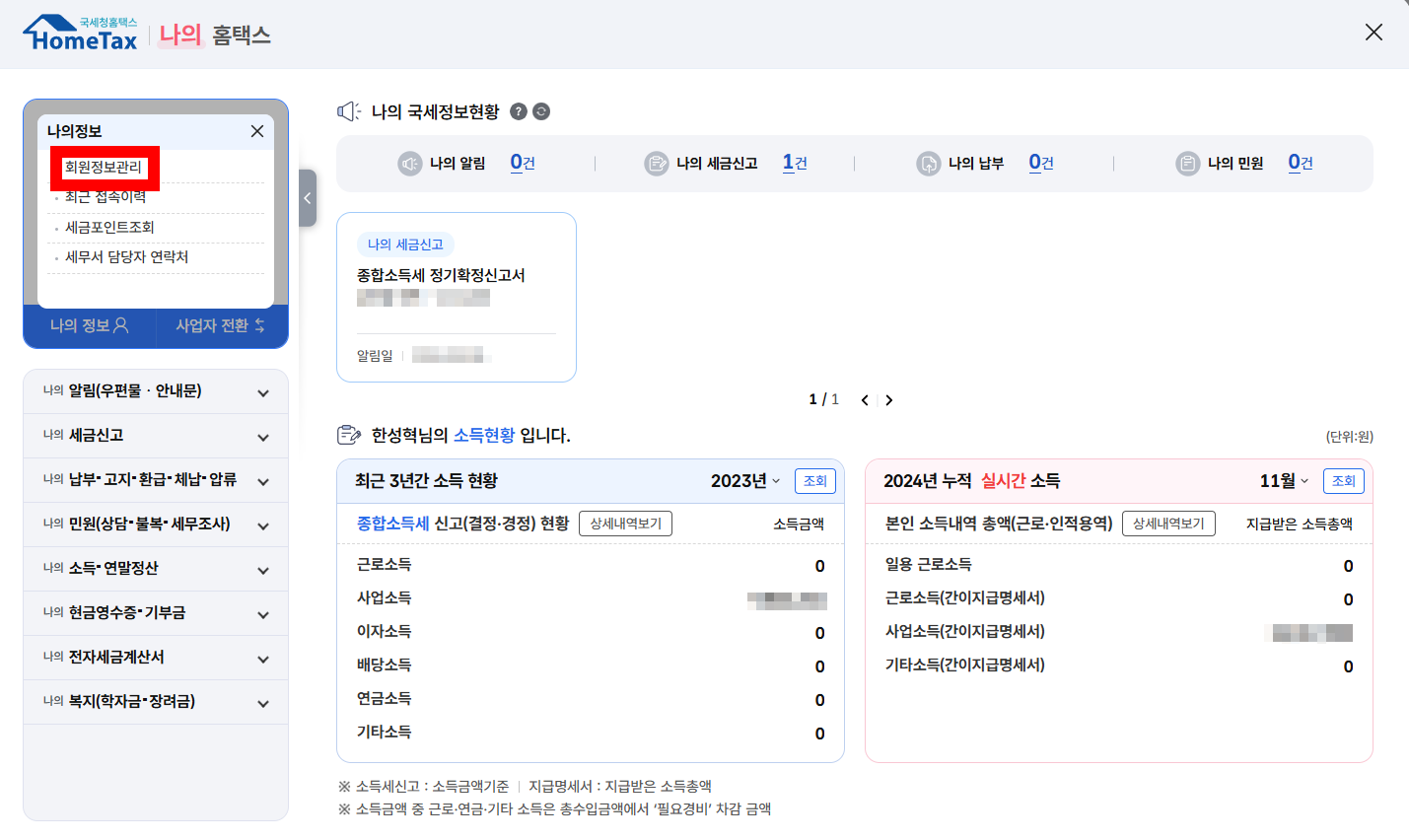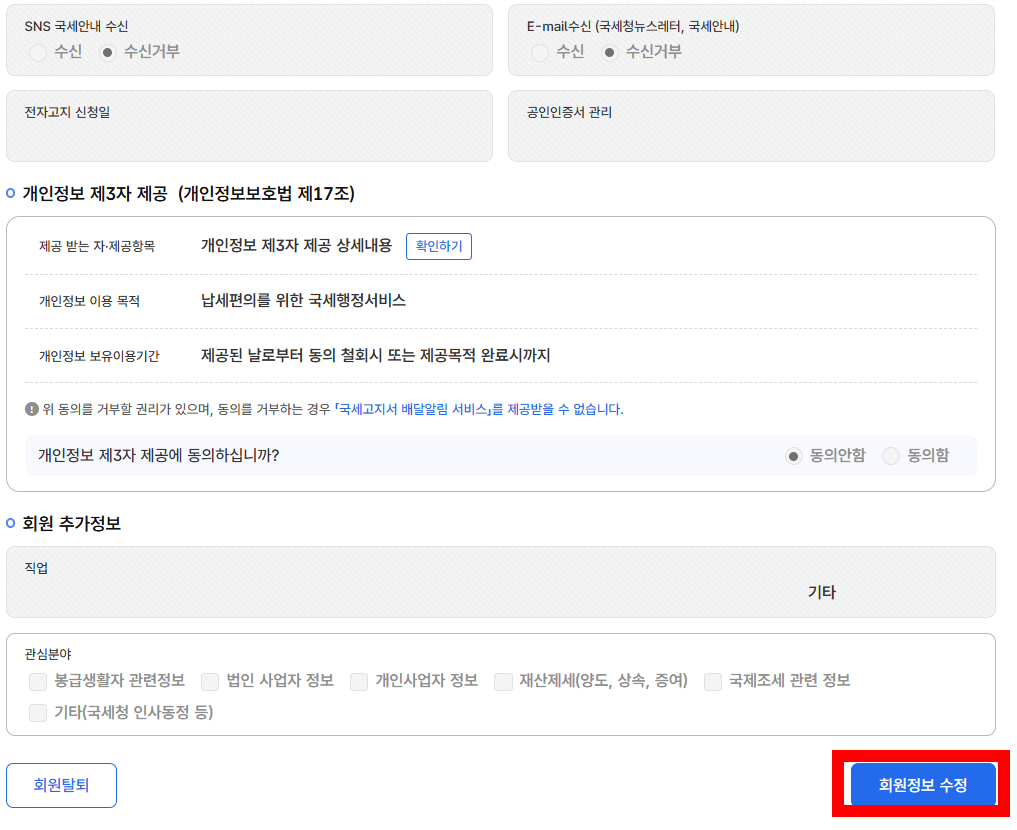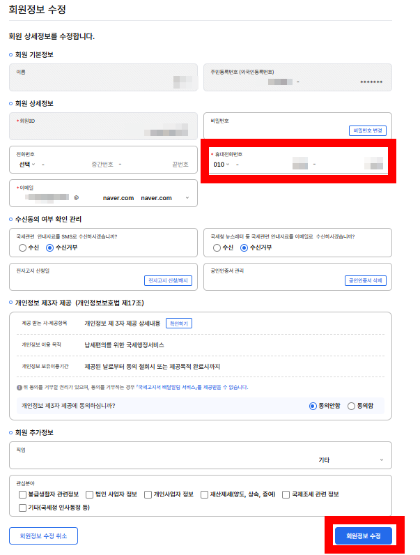 Tip: 전화번호 변경 시 반드시 홈택스에서 업데이트하세요. 등록된 번호는 소득공제 내역 확인 및 간편 발급에 활용됩니다.
