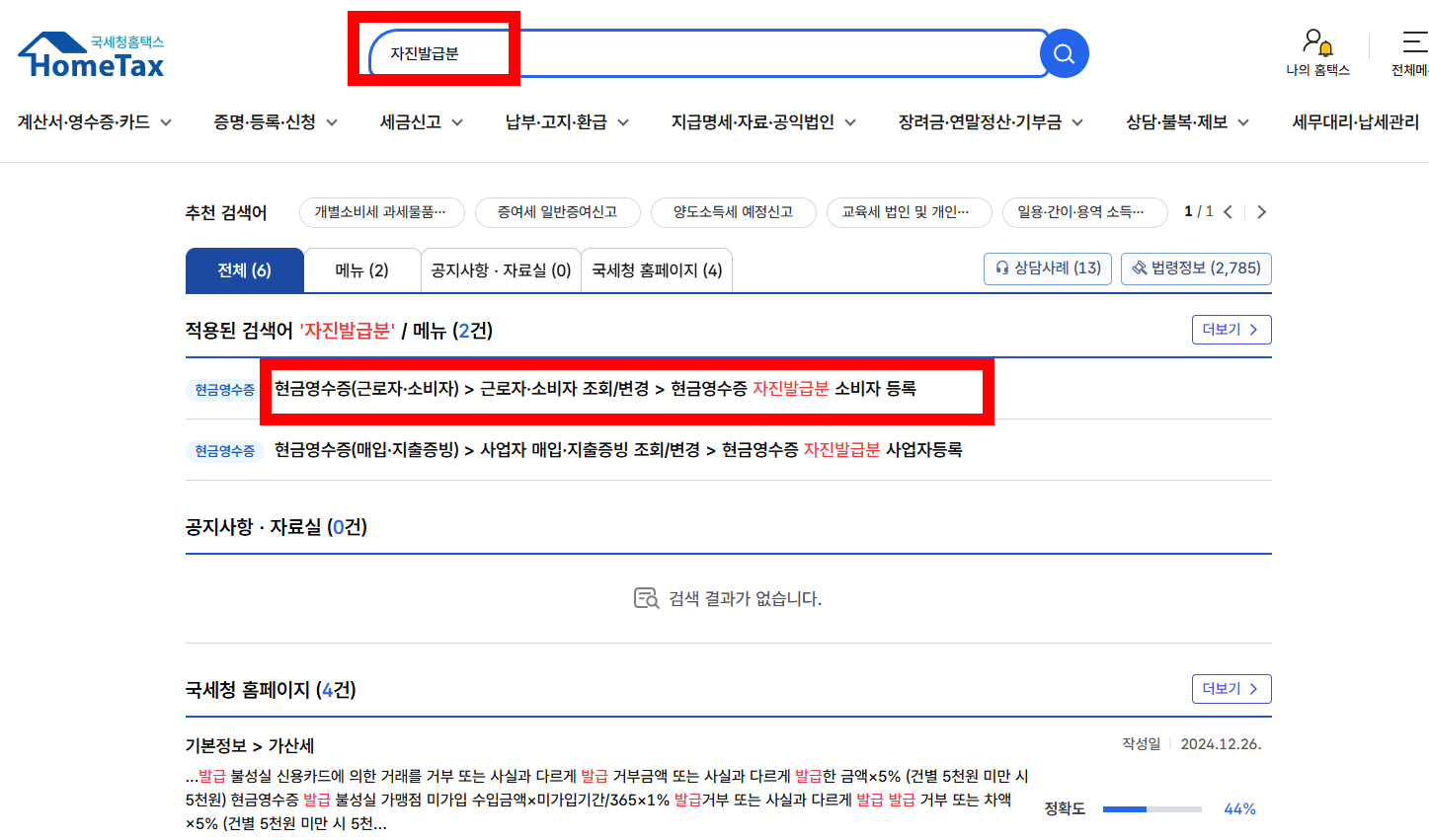- 상단 검색창에 '자진발급분'을 검색합니다.